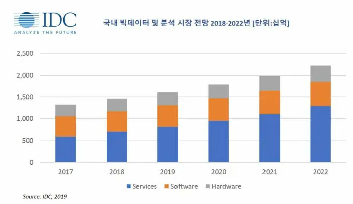 이 같은 전망은 한국IDC가 발표한 국내 빅데이터 및 분석 시장 전망, 2018-2022 연구 보고서에 따른 것. 한국IDC 측은 빅데이터·분석 시장 성장은 빠르게 변하는 비즈니스 환경에 대처하면서 데이터 흐름을 실시간 수집하고 분석하는 게 과거보다 중요한 화두가 되기 때문으로 풀이했다. 인공지능 시스템 구축 수요 충족을 위한 데이터 필요성도 늘어났다는 점 역시 시장 성장에 기여한 것으로 분석했다.