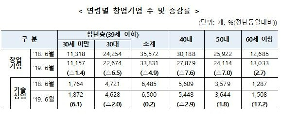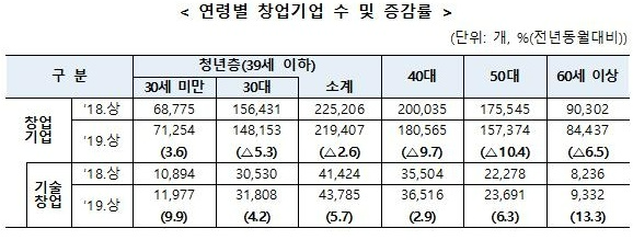 연령별로는 30세 미만(3.6%↑)에서 상반기 창업기업이 지난해 상반기 대비 증가하였으며, 기술창업의 경우 30세 미만(9.9%↑)과 60세 이상(13.3%↑)을 중심으로 모든 연령대에서 지난해 상반기 대비 증가하였다.