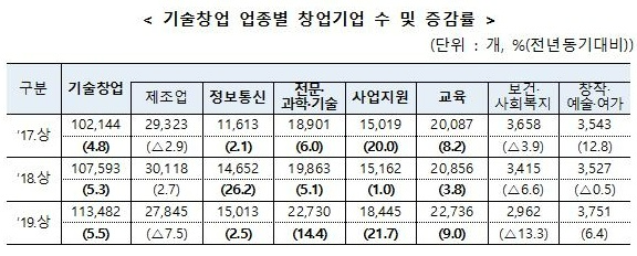 기술창업 중에서는 정보통신업과 전문·과학·기술서비스업(연구원·전문직 등), 사업지원서비스업(고용알선, 여행·사무보조 등), 교육서비스업 등 지식기반 서비스업의 증가세가 두드러지게 나타났다.