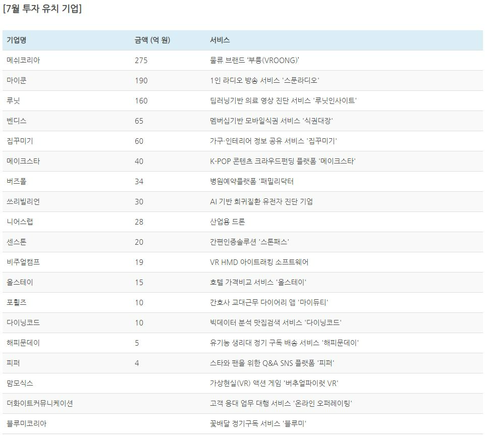 ■ 7월 투자 유치 32개 기업, 965억 원 규모…메쉬코리아 275억 투자 유치 외
