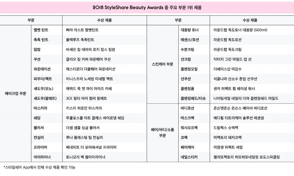 스타일쉐어, 뷰티어워드 2018 결과 발표